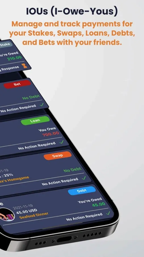 - Create and manage Poker Stakes, Swaps, Loans, Debts, and Bets with your friends inside the app