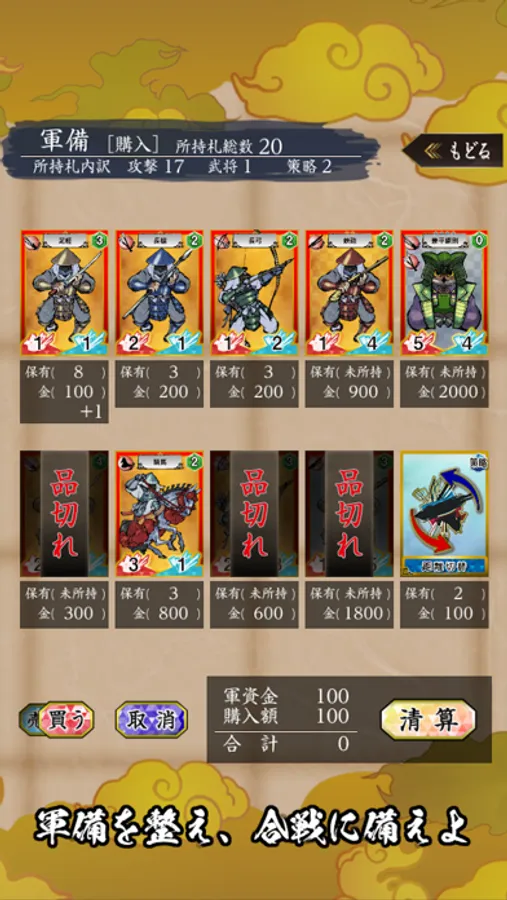 強力な攻撃札(兵)を集め、策略札を駆使し、戦功札(建物や拠点)を稼ぐことで合戦を勝利に導いてください。合戦に勝利し新たな領地を手に入れると秋の税収が増えます。軍資金を集めて更に強力な攻撃札を買い入れましょう。
