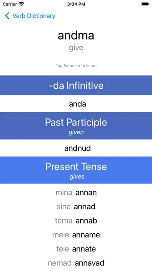 Learn and practise Estonian verbs with this interactive verb reference and drill tool. With over a hundred core verbs presented in the present, past and conditional, in both positive and negative paradigms, Verb Blitz is a clear and effective way to refresh and revise beginner's grammar, as well as expand your everyday vocabulary.