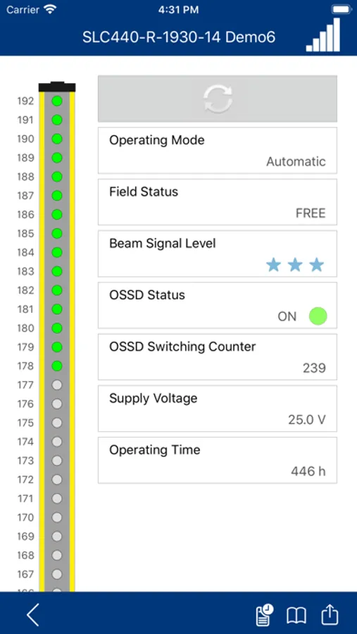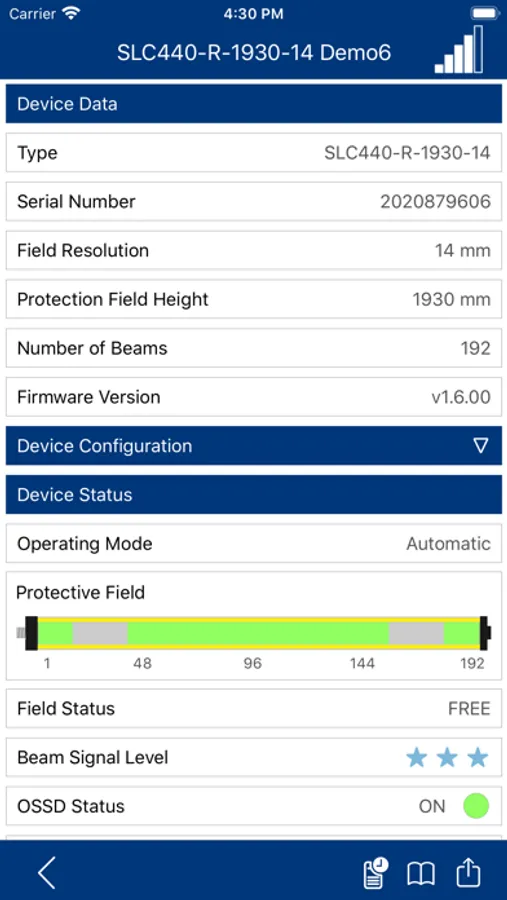 With the display of the device status you see the signal strength of each individual beam in real time, the active operation mode, the status of the OSSD outputs and the status of the protective field. It is self-evident that you see if the protective area is interrupted.