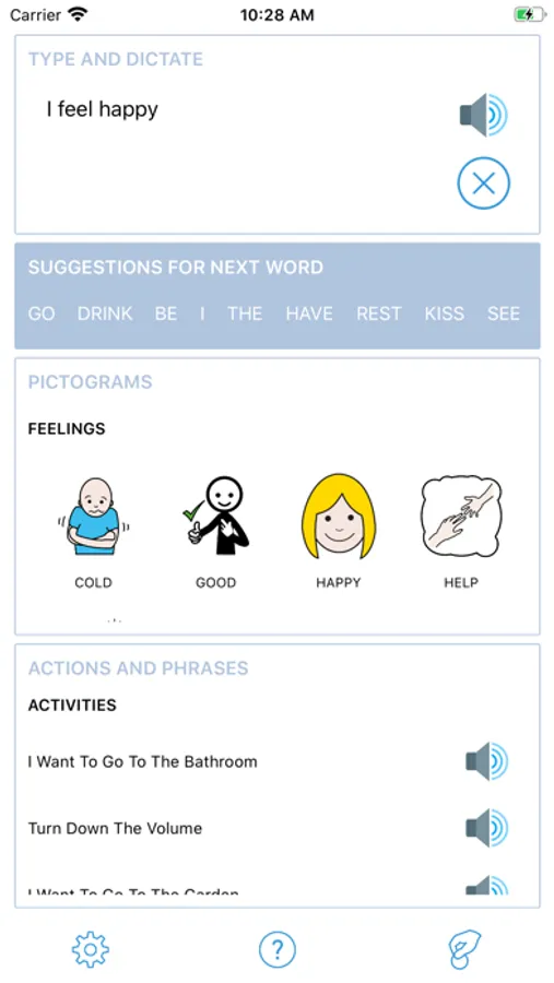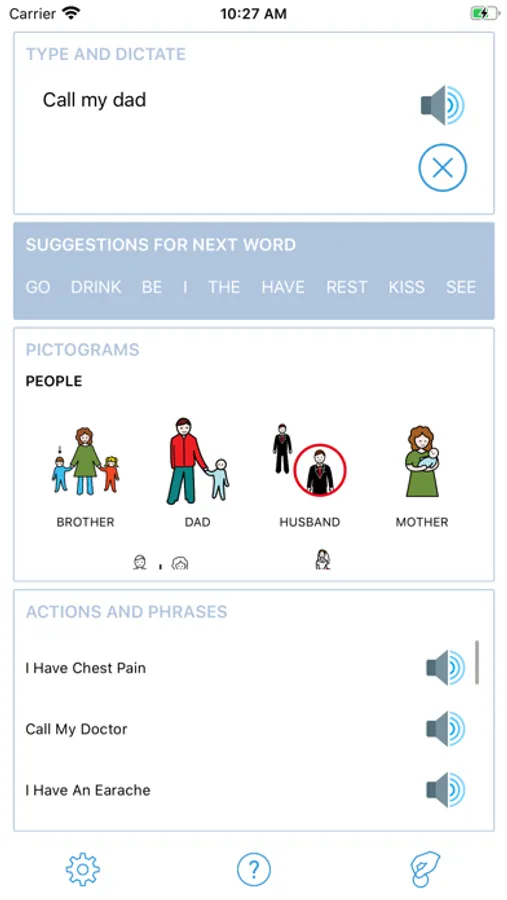 Pictograms that indicate daily activities and feelings help the user to assemble the phrases dictated by the narrator.