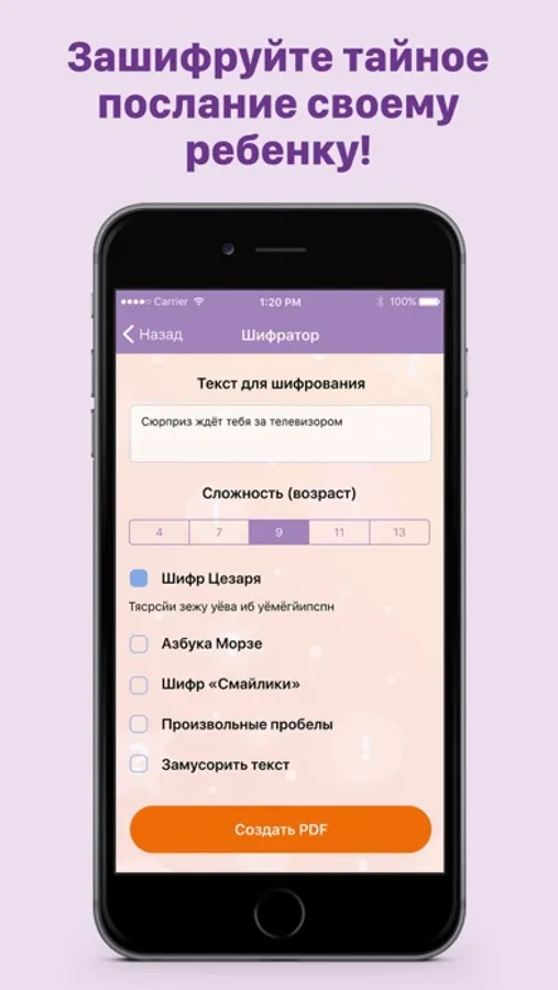 Шифратор - позволяет зашифровать любое ваше послание одним из 6 шифров и выдает его в виде пдф файла вместе с ключом к шифру.