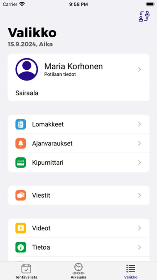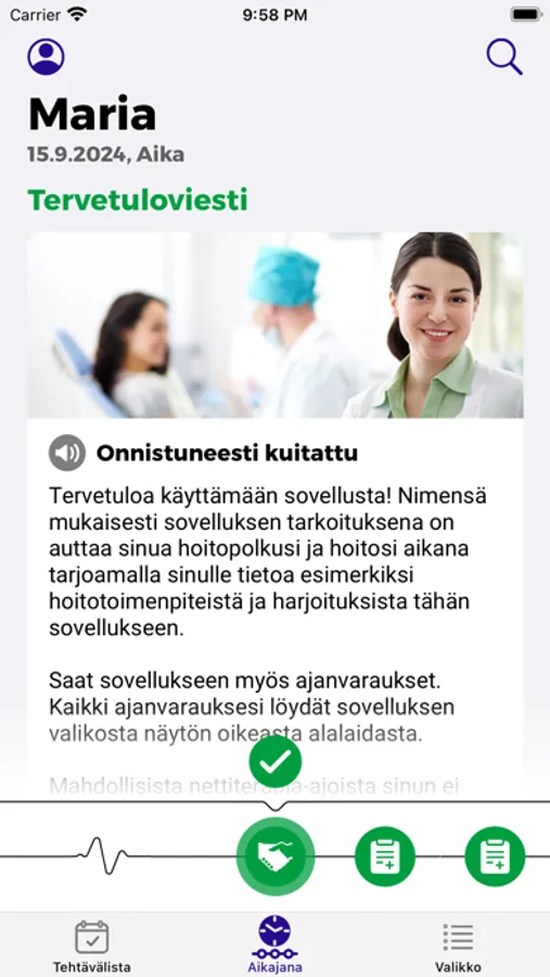 Satasairaala Mobiiliapuri -sovellus tarjoaa käyttäjälleen kaiken tiedon hoitoon liittyen helposti ymmärrettävässä muodossa. Aikajanalta potilas voi nähdä hoitoonsa liittyviä tapahtumia ja tehtäviä ja kuitata ne suoritetuiksi.