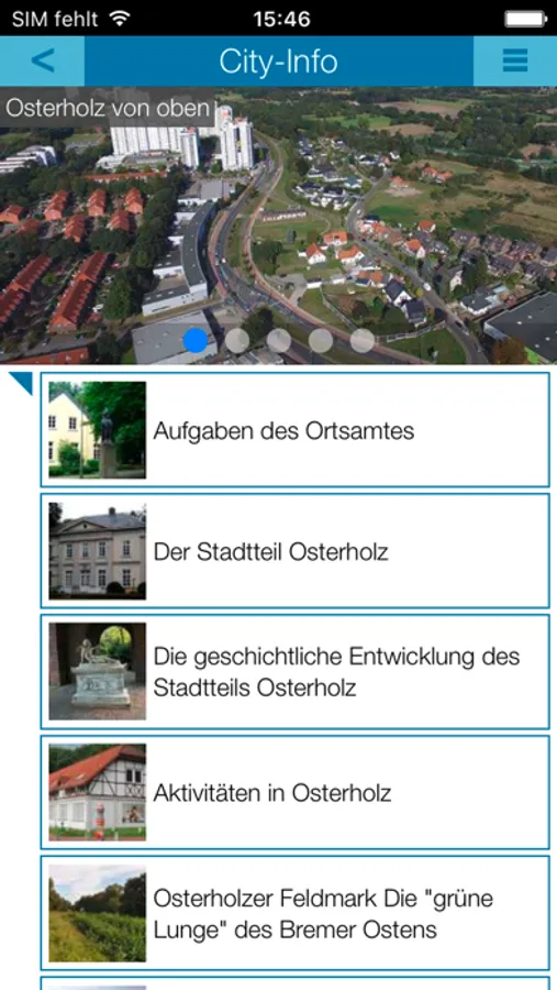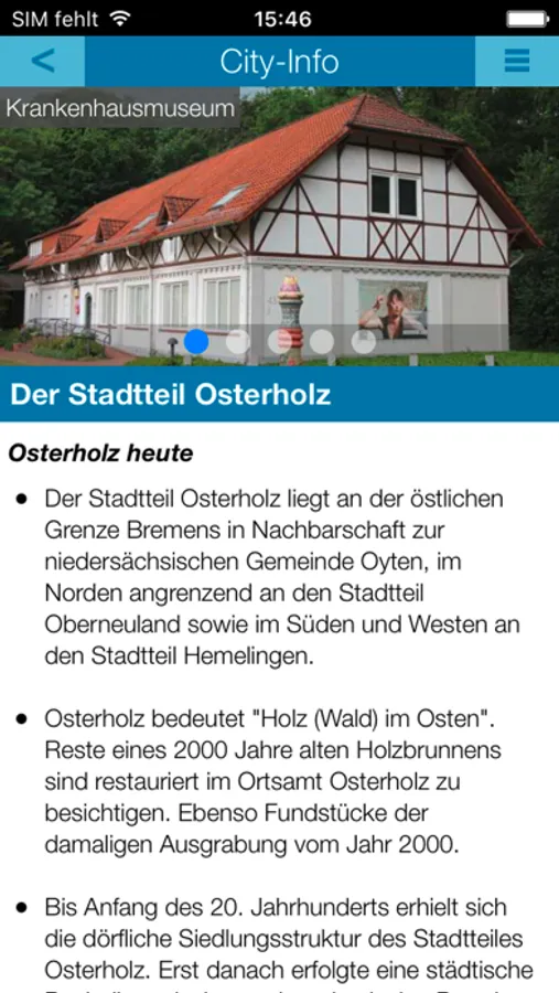 Mit der Bremen-Osterholz-APP erhalten Sie ausführliche Informationen über die Stadt, einen übersichtlichen Rathaus-Wegweiser, nützliche Hinweise zu Sehenswürdigkeiten, interessante Kultur-, Freizeit- und Sportangebote, ein regionales Branchenbuch und ein umfangreiches Ärzteverzeichnis sowie aktuelle Nachrichten und Veranstaltungshinweise. Ob Sie die App als Bürger, Neubürger, Gast oder als Unternehmer bzw. Freiberufler nutzen - Sie sind stets auf dem Laufenden.