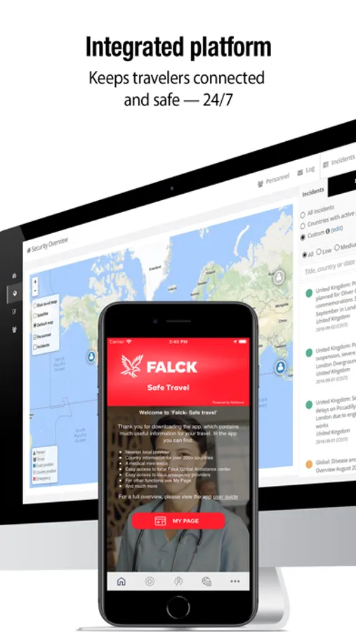 It integrates two security tools: the Falck Safe Travel app and the Falck Instant Security Overview (ISO) web portal.