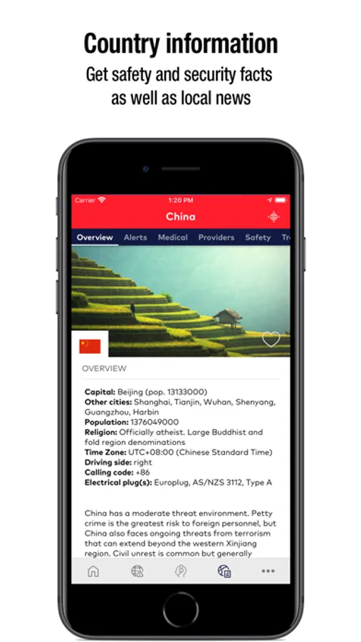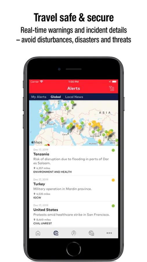Receive push and SMS alerts to help you steer clear of trouble, such as extreme weather conditions and natural disasters, travel disruptions, political and civil unrest and terrorism threats.