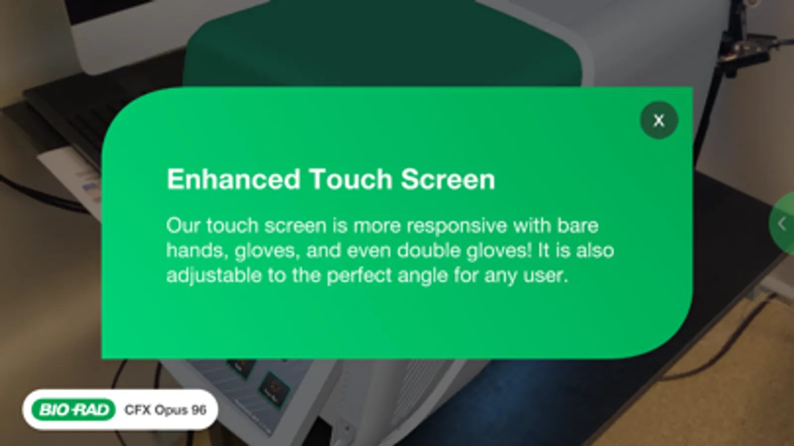 This augmented reality (AR) app allows you to see the CFX Opus Real-Time PCR System, CFX Duet Real-Time PCR System, and PTC Tempo Thermal Cycler in your lab. A life size visualization of the instrument can be placed on an open flat surface in your lab where you can see the major features of Bio-Rad’s modern qPCR systems and conventional thermal cycler.