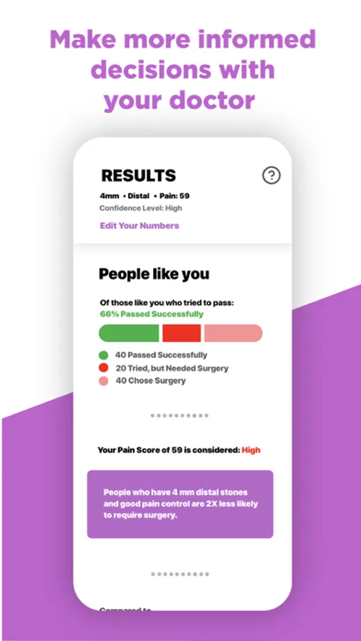 If you suffer from kidney stones (a condition called nephrolithiasis), Stone Pass helps you make decisions with your doctor — through real data about what happened with people who had a kidney stone similar to yours.
