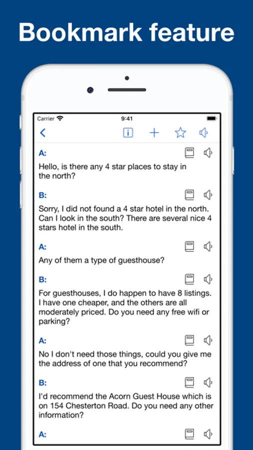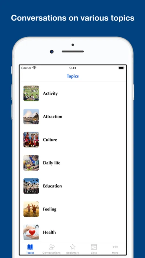 - Various topics for you to choose: activity, attraction, culture, daily life, education, feeling, health, hospital, hotel, job, money, police, relationship, restaurant, transport, etc.