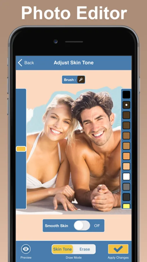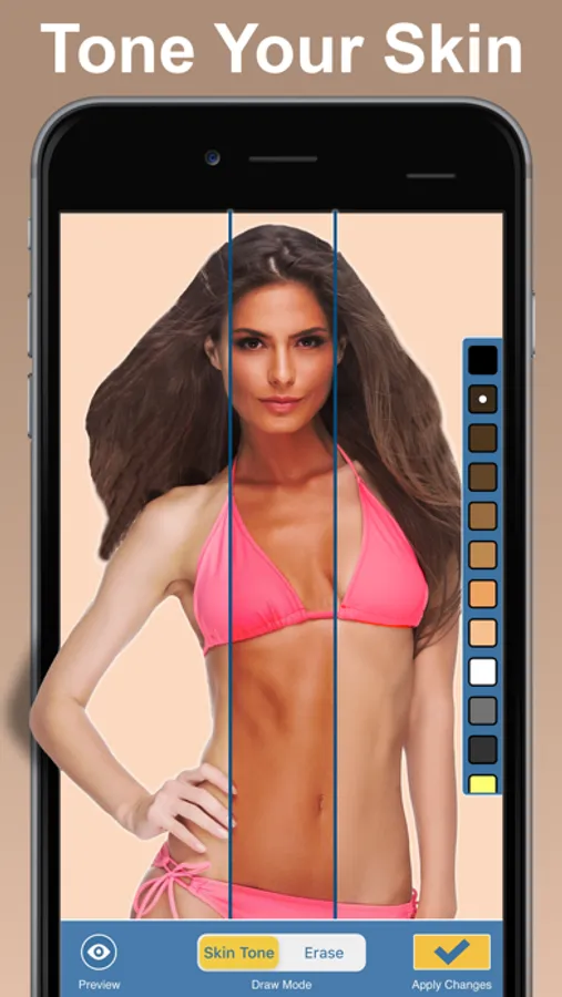 Want to change the color of your skin? Use our skin tone booth app to seamlessly adjust your skin. Using our powerful photo editor, you will be able to select only the areas of the body you want to change and then choose from a selection of skin tones to get the perfect color. You can make multiple edits per photo to ensure every part of your party is perfectly toned.
