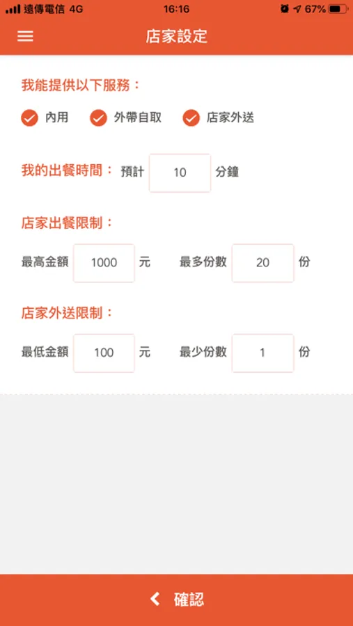 可自行輕鬆上架新餐點、上傳餐點圖片、更改價錢等設定。一鍵開店,一鍵切換付款狀態,讓你輕鬆掌握訂單資訊。還能設定內用、外帶、外送的接單狀態!