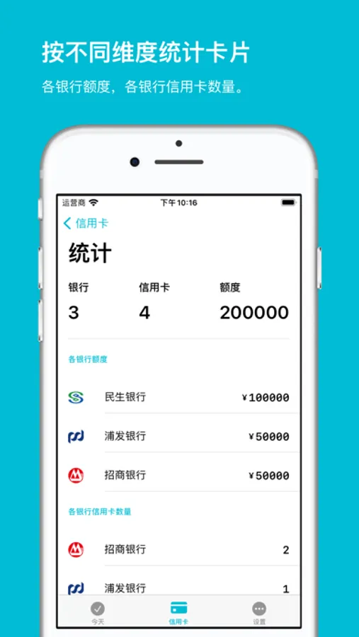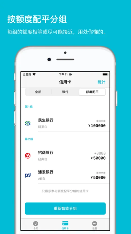 - 满足资深卡友需求:支持按额度配平,把信用卡分为额度尽可能相同的几组;支持按银行统计额度。