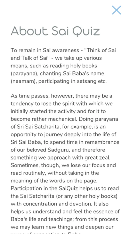 The SaiQuiz app offers quizzes in Daily-, Practice- and Event-based formats. The Daily Quiz gets refreshed every day with new questions at 6:00 AM IST. Individual progress can be tracked under ‘Personal History’ for the Daily Quiz. The Practice Quiz can be retaken multiple times until one feels confident to attempt the Daily Quiz. During special occasions, an Event-based quiz will be available with a broadened scope to include various other books on Sri Sai Baba.