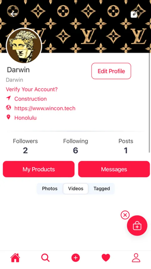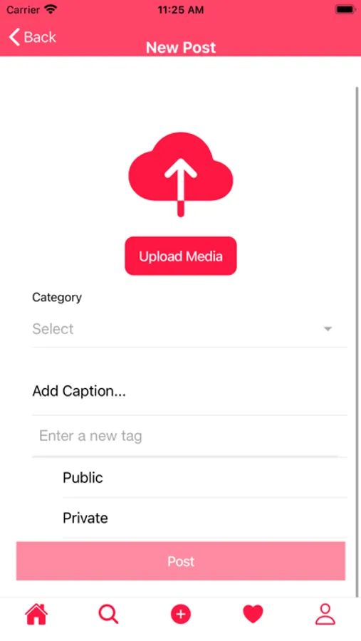 The Profile tab presents all of the user's photo and video posts in one place and a short bio. To post a photo or video, click the Camera tab, which will give the option of taking a photo or video from within the app or choosing a photo or video from the device's library.