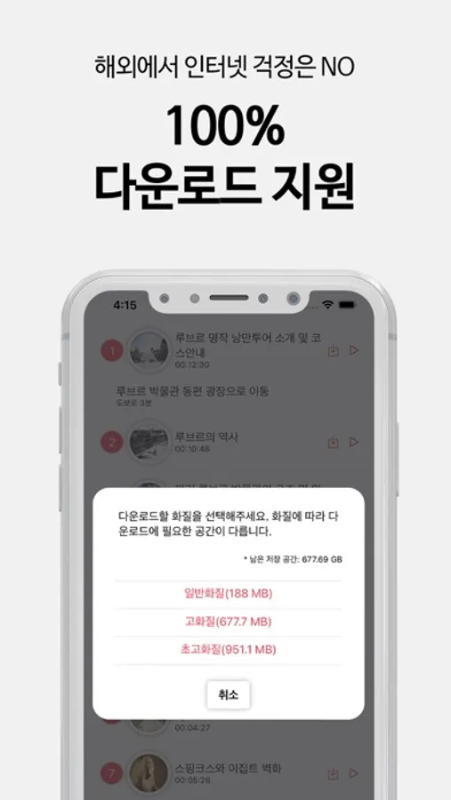 • 데이터 부담 및 해외 네트워크 환경을 고려한 다운로드 서비스(화질 선택 가능)
