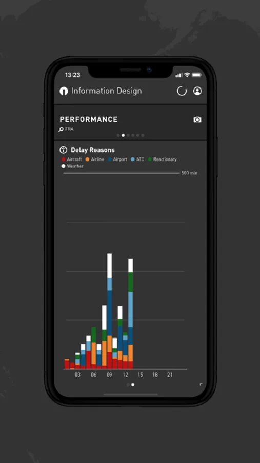 The visualization has a modern design that gets to the heart of information. Use a column chart to see if the punctuality of your flights changes throughout the day. Or watch every single flight move across the world map — tackling any kind of unpunctuality. With aWall you always have a clear picture of the current situation.