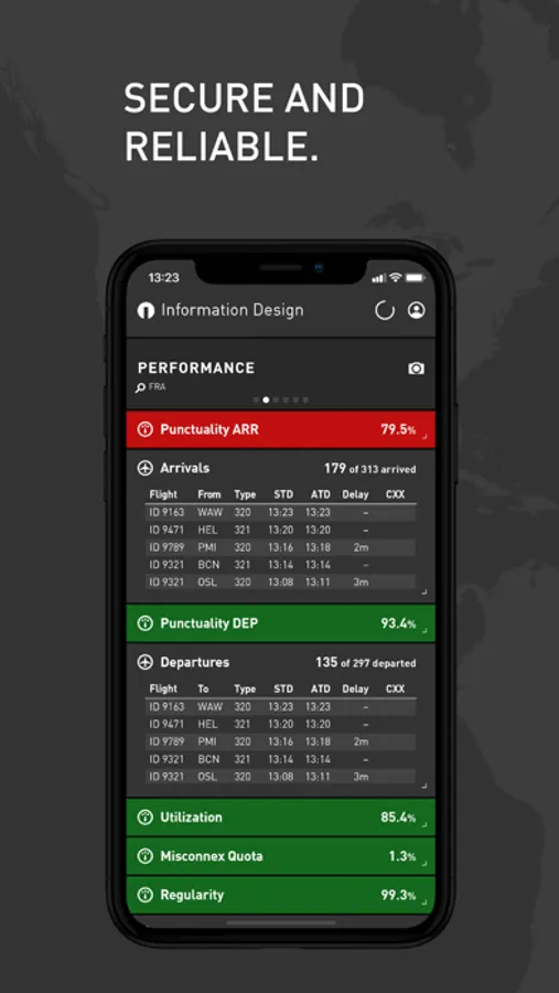 Real time KPIs are delivered to your device, due to aWall’s own business intelligence platform, working in the background. Air traffic control measures or weather conditions impede flight operations? You’re the first to know. The de-icing at your hub airport isn't fast enough? You’re the first to know. Flights arrive more than three hours late? You’re the first to know.