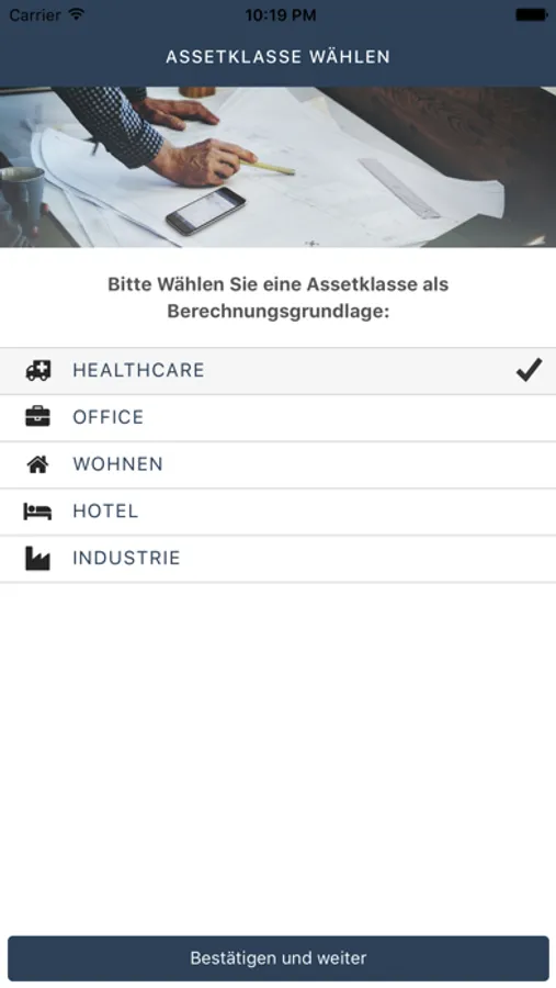 In der CORES Planer App kann man wählen zwischen den Assetklassen Industrie, Retail, Hotel, Healthcare, Office und Residential.