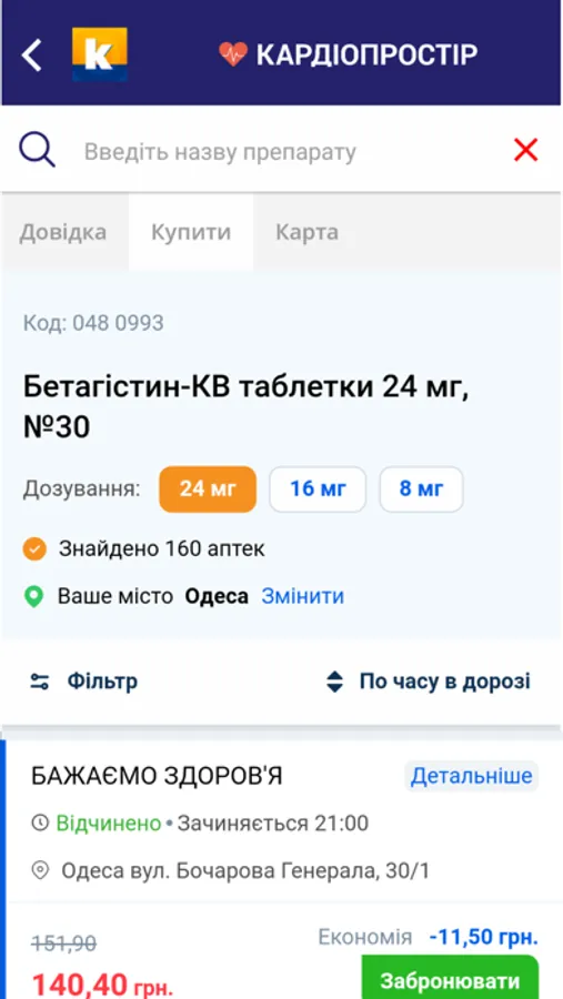 - актуальну інформацію про ціну і наявність необхідного препарату в найближчих аптеках;