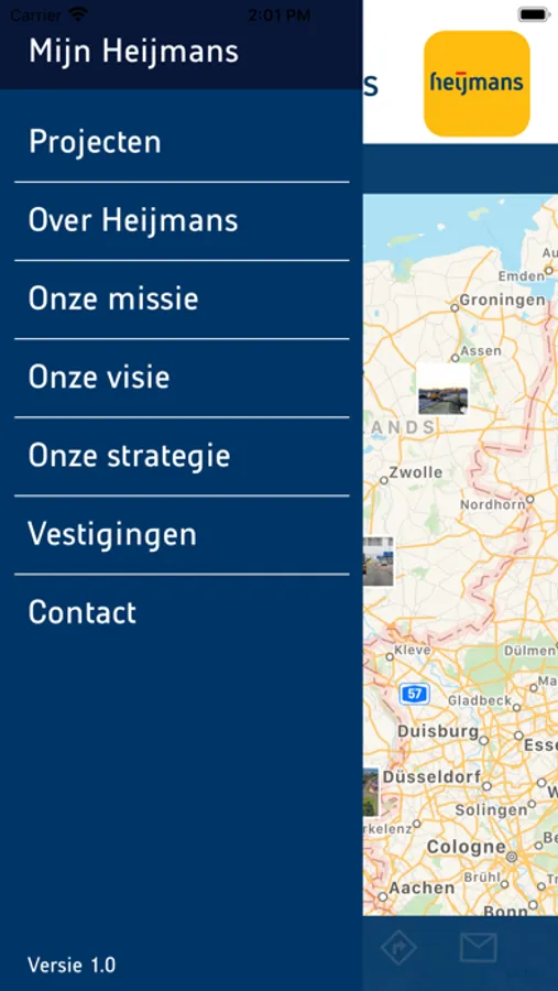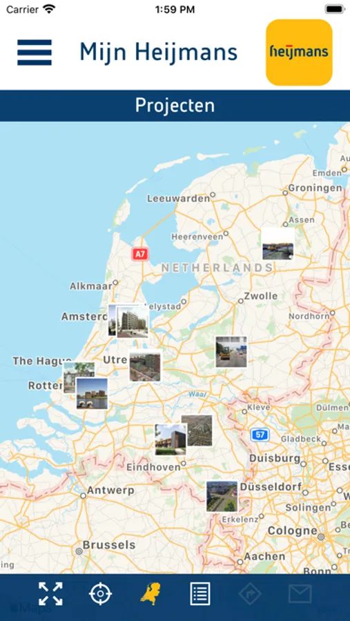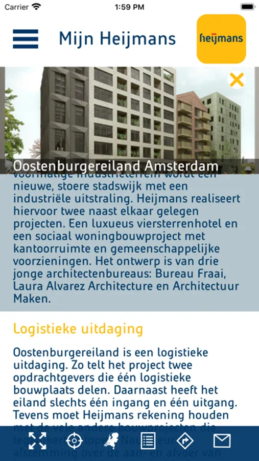 Met de Heijmans app kunt u informatie verkrijgen over projecten op het gebied van woningbouw en infrastructuur in uw buurt en onderweg. U kunt de voortgang zien van de bouw van uw nieuwe huis, of van de nieuwe weg die wordt aangelegd in uw directe omgeving of op uw reisroute. U kunt zien wanneer u hinder kunt ondervinden van onze bouwwerkzaamheden. Daarnaast biedt de app eenvoudig de mogelijkheid om vragen te stellen of opmerkingen te plaatsen bij onze projecten, bijvoorbeeld als u een klacht heeft over de uitvoering. Ook biedt de app de mogelijkheid om naar een project te navigeren, zodat onderaannemers en hun werknemers niet hoeven te zoeken.
