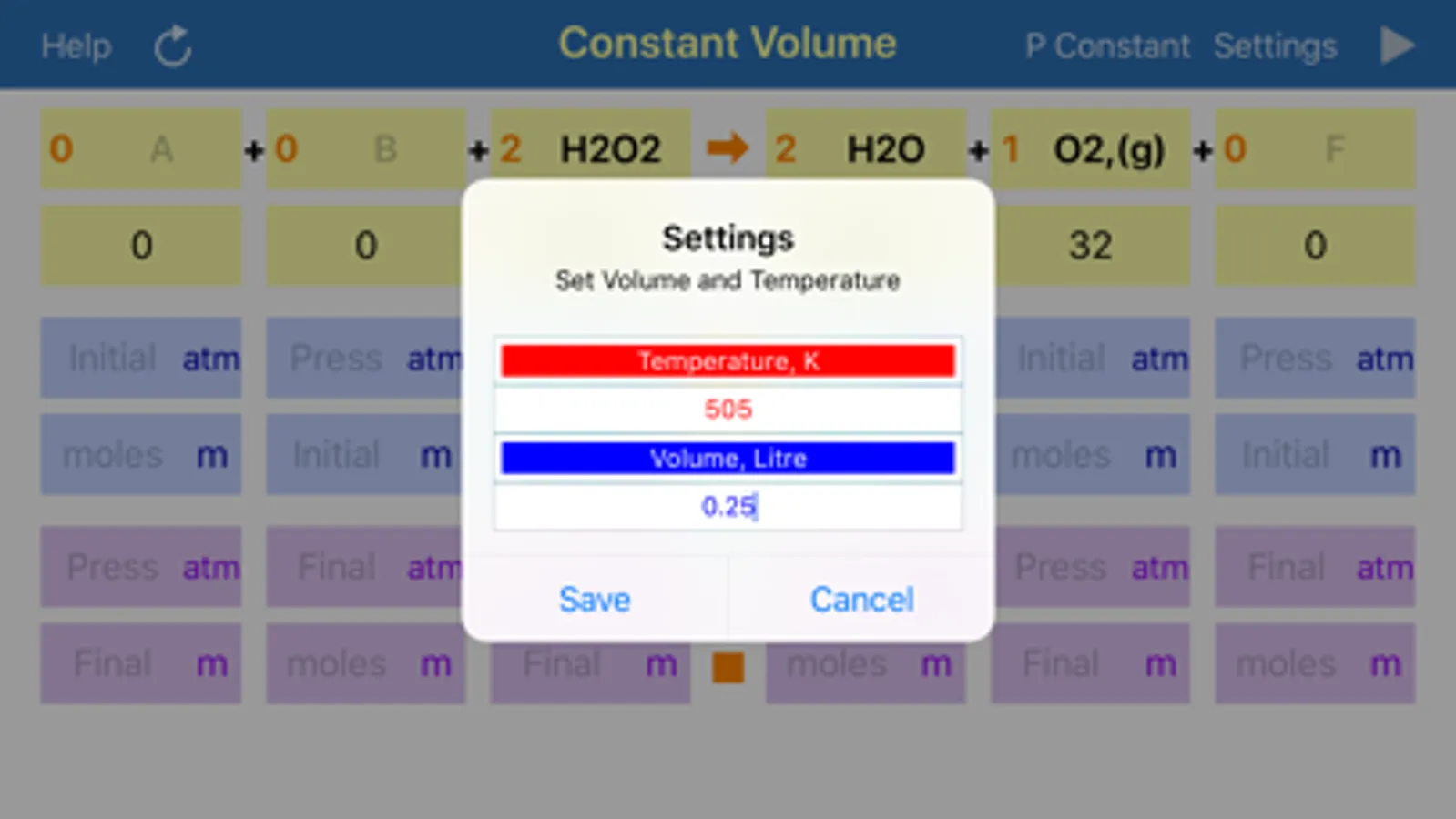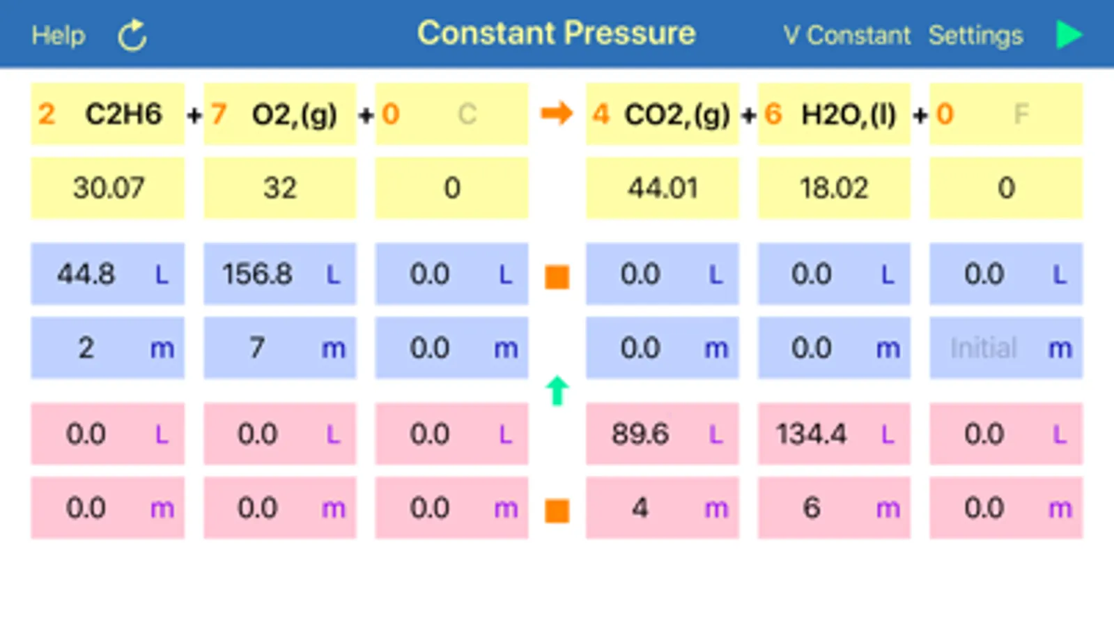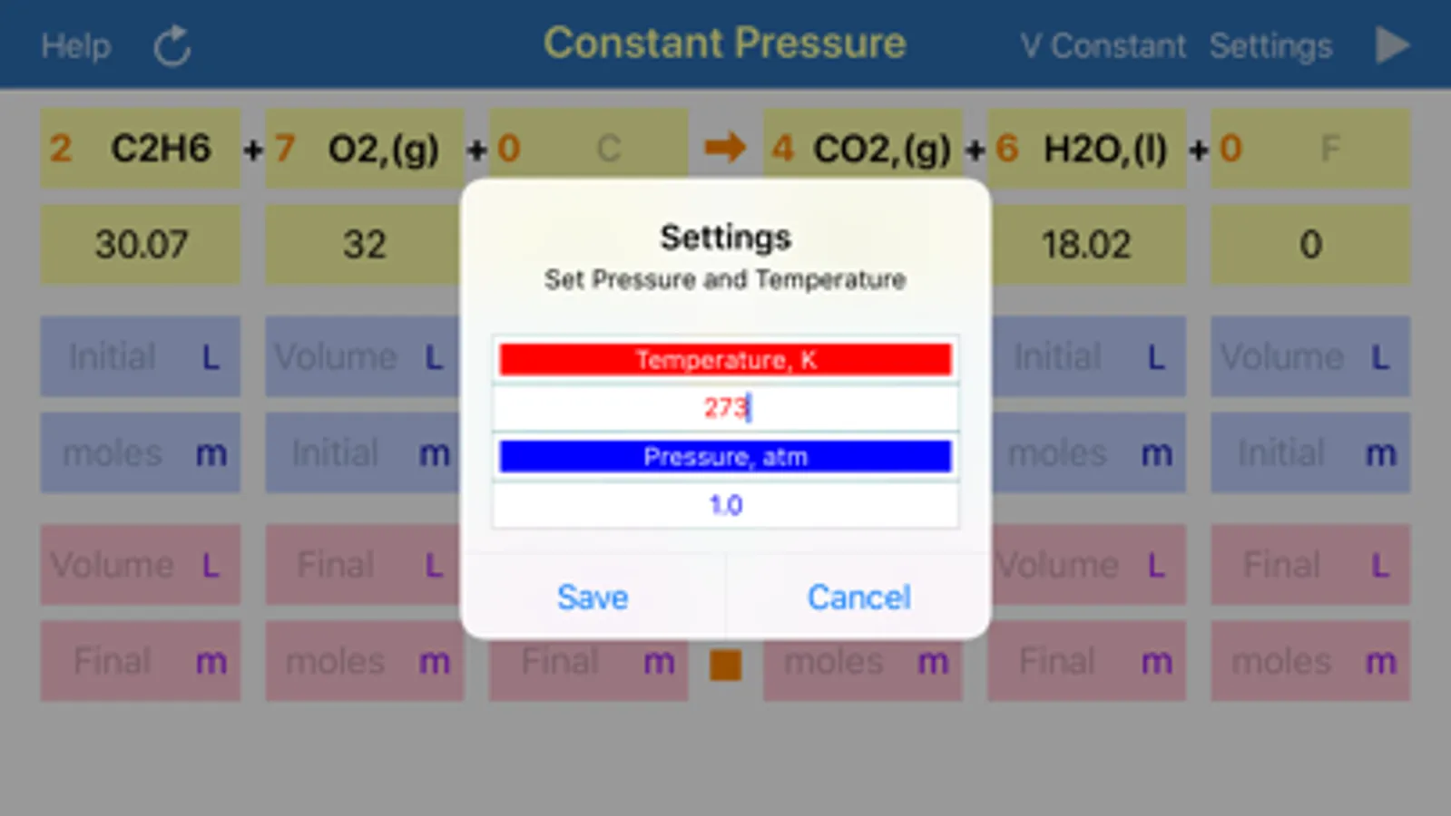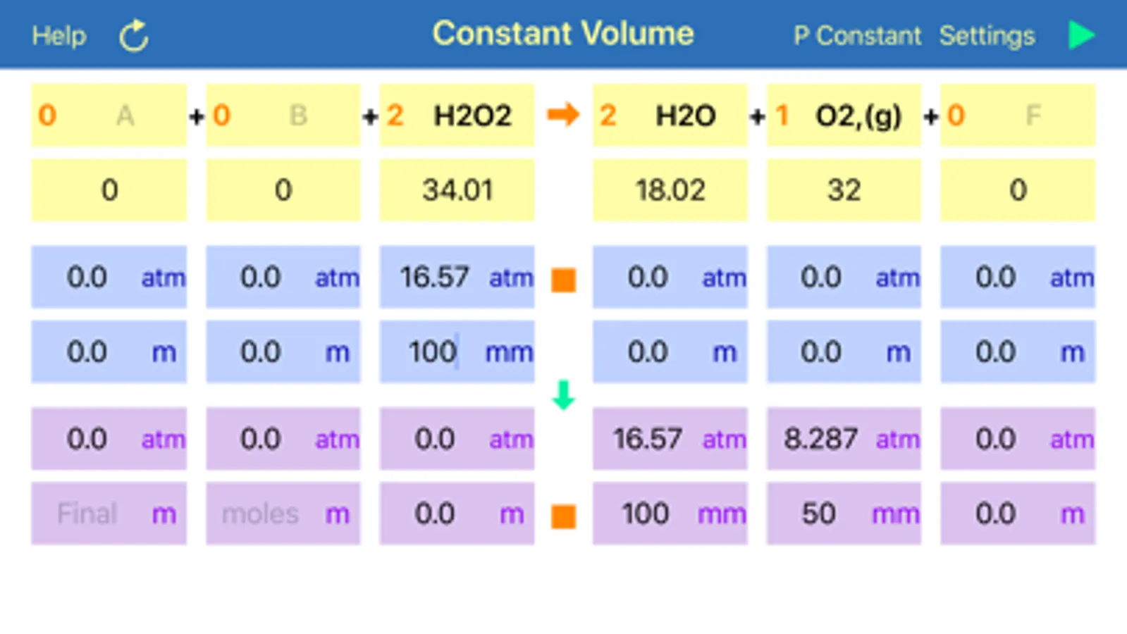 Application provides two layouts: the first is for reactions occurring at the user defined constant volume, where moles and partial pressures of compounds are calculated and the second is for reactions occurring at the user defined constant external pressure, where moles and volumes of gaseous compounds are analysed.