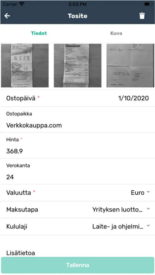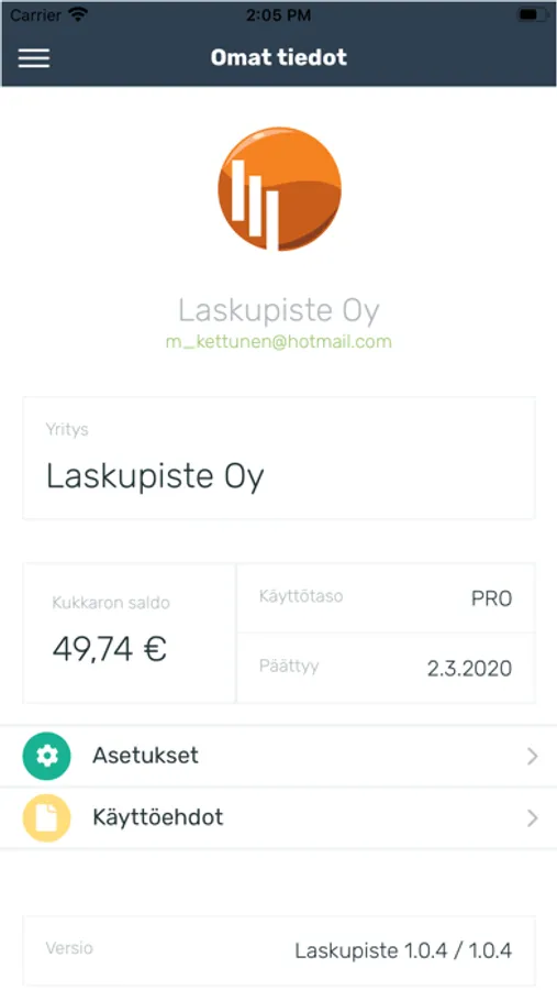 Laskupisteen mobiilisovelluksella skannaat kuitit ja tositteet, seuraat työaikaasi sekä katselet Laskupisteen selainkäyttöliittymän kautta lisättyjä dokumentteja.
