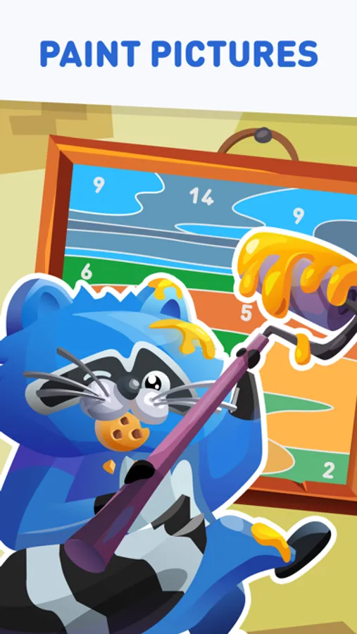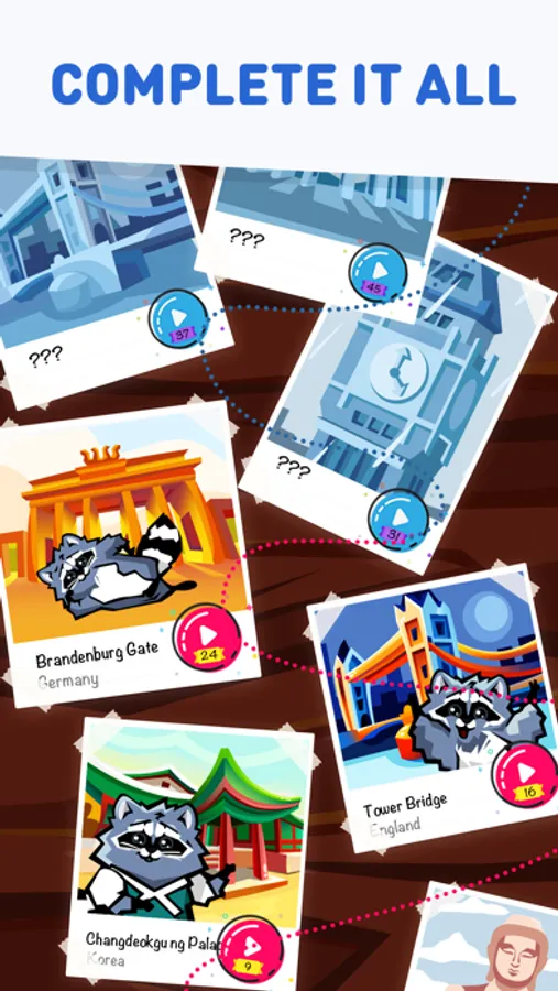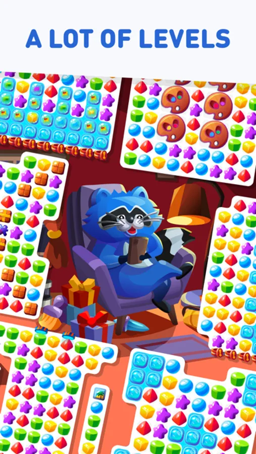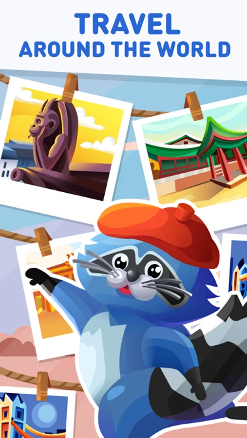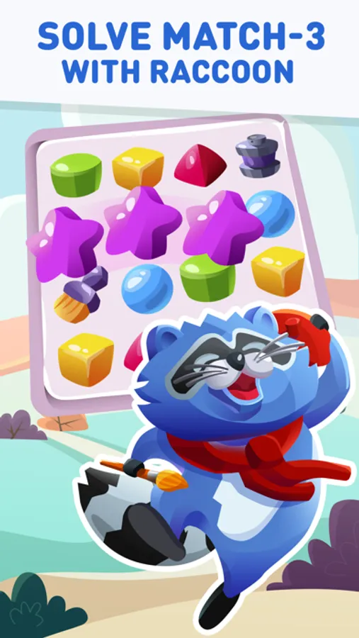 Solve puzzles in the "match-3" genre to help raccoon Moon paint pictures and travel around the world.