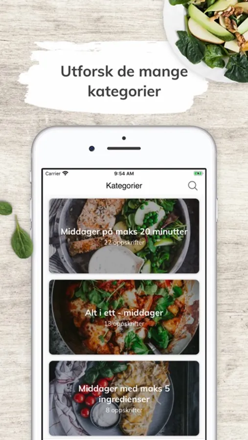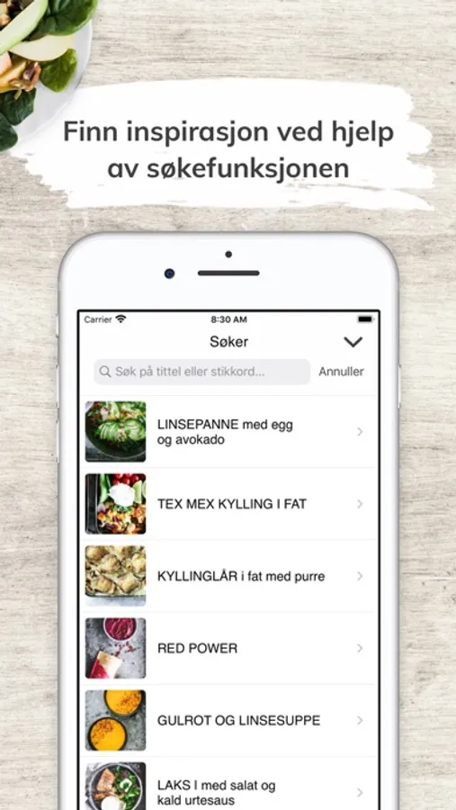 - Søk etter oppskrifter med spesifikke ingredienser, preferanser eller allergener. Eksempelvis: glutenfritt, vegansk, fisk