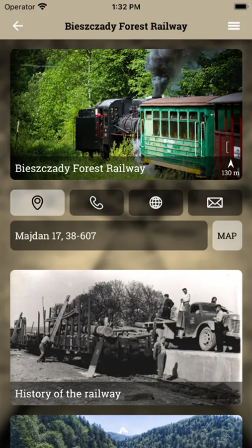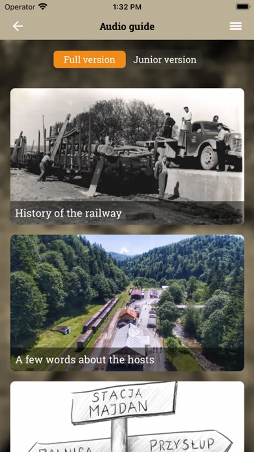 The application adds to the experience that offers the journey of the Bieszczady Forest Railway. The built-in audio guide allows the user to listen to or read information about the places passed along the route while traveling. Additionally, the trip can be even more special by playing a field game that will broaden users’ knowledge about the Bieszczady Mountains.