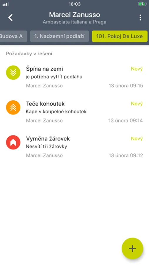 Nahlaste nový požadavek. Zvolte závadu (např. Špína na zemi) nebo popište vlastní závadu do pole Předmět. Zvolte kategorii (např. Údržba), prioritu (např. Nízká) a zadejte popis problému a přidejte fotografie.