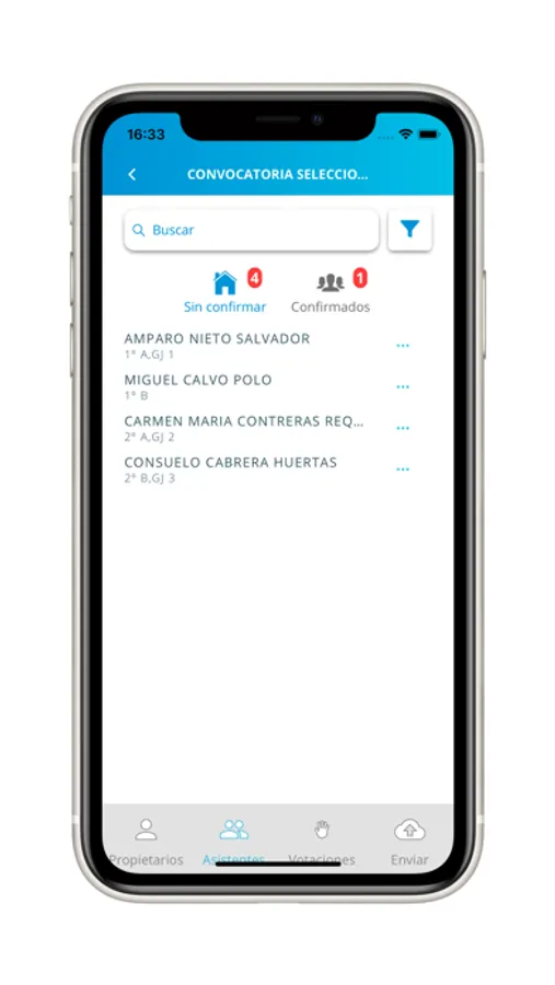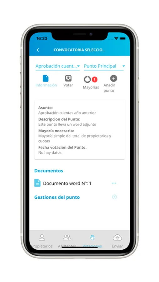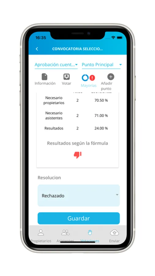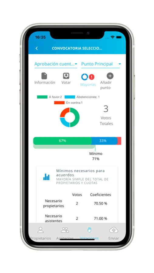 Con la app se puede anotar las asistencias y representaciones y registrar los votos de los temas. La aplicación calcula los resultados de las votaciones, tanto por cantidad de votos como por cuotas de las votaciones.