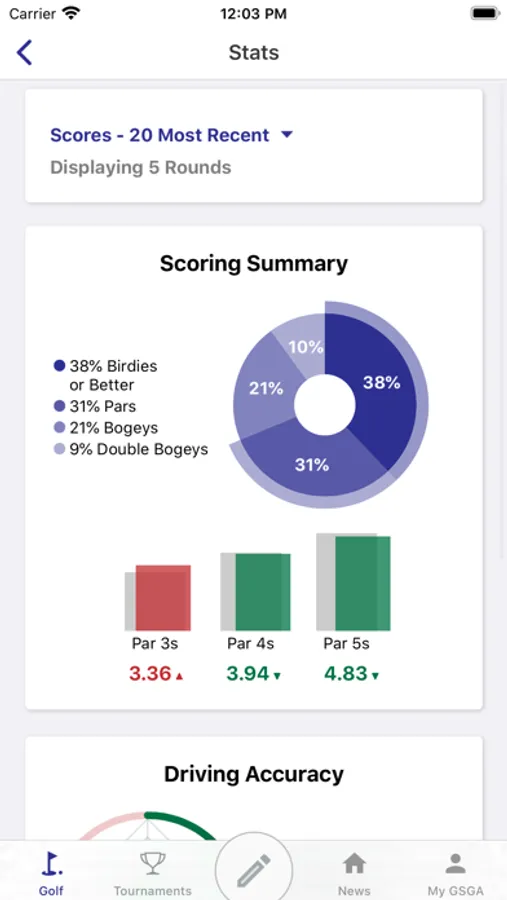 - Score posting, including hole-by-hole stats (GIR, Putts, Fairways, etc.)