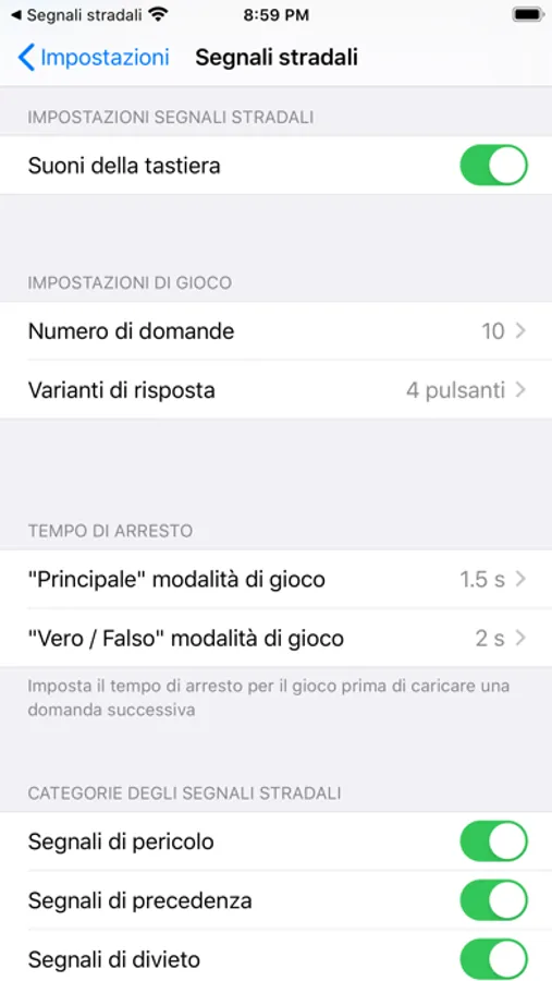 * I segnali sono divisi in categorie: è possibile selezionare solo i gruppi di segnali stradali necessari per allenamento e gioco;