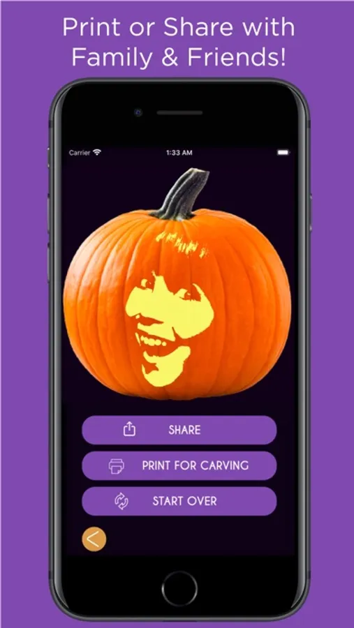 Introducing the Pumpkin Masters Carve Your Selfie App. This app lets you turn a selfie into a Jack-O’-Lantern design you can then carve on a real pumpkin! First, choose a photo from your phone’s library or take a new photo – can be a selfie, a picture of your child, your pet, and more. Then, use the controls to adjust the contrast and edit your image. Before you know it, you will have your own personalized Jack-O’-Lantern design. You can share it with your friends digitally or print it out for carving onto your pumpkin. The perfect app for carving out some time with friends and family this Halloween.