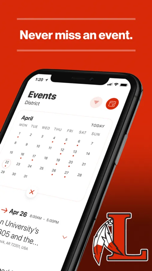 The event section shows a list of events throughout the district. Users can add an event to your calendar to share the event with friends and family with one tap.