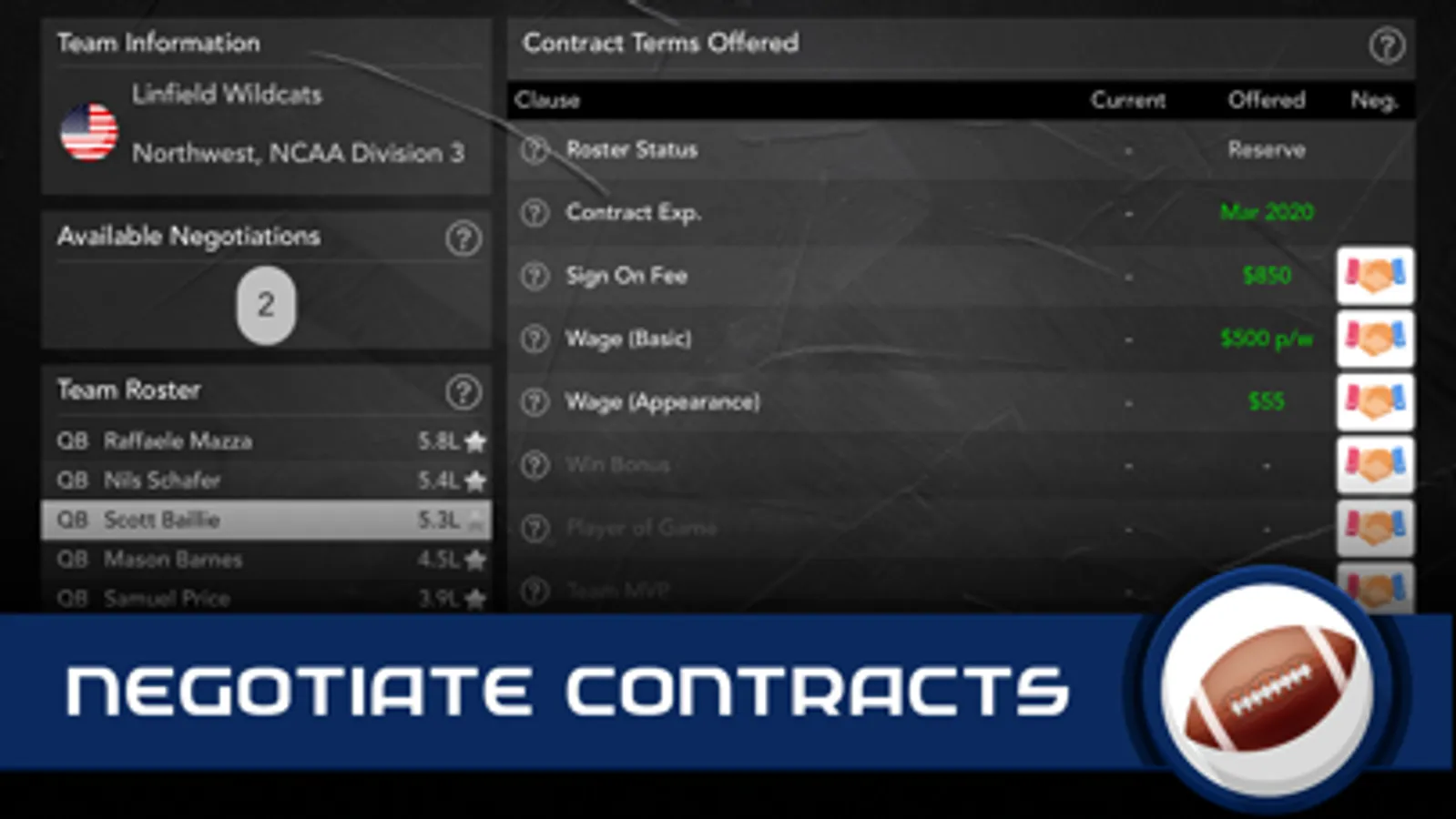 Negotiate contracts to ensure you get the deal you deserve! Perhaps you add a bonus for reaching the play-offs or for becoming the team MVP? You need to make sure you get the deal you want, after all, if you are good at something never do it for free!