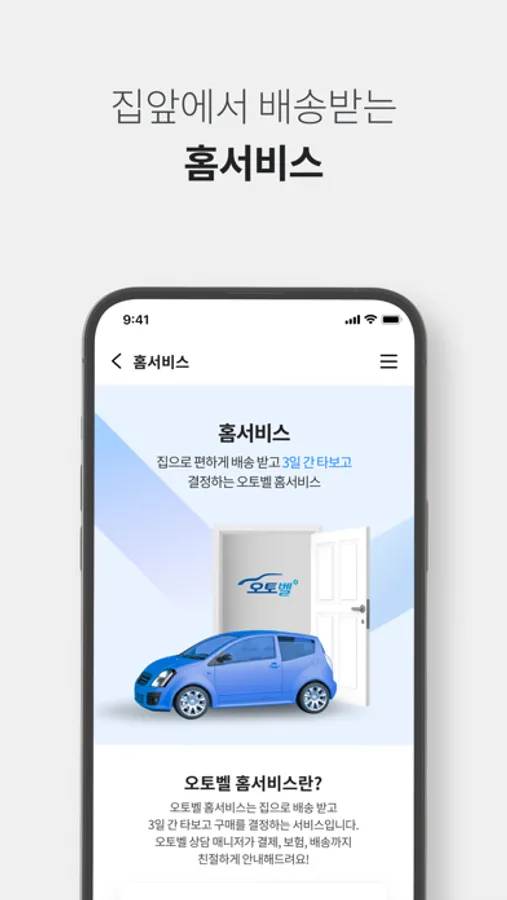 홈서비스 - 집앞에서 배송받고 3일간 맘편히 타보세요.