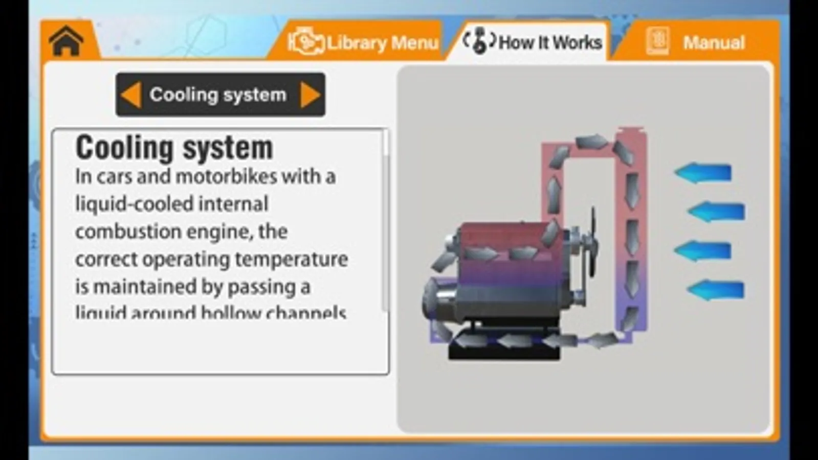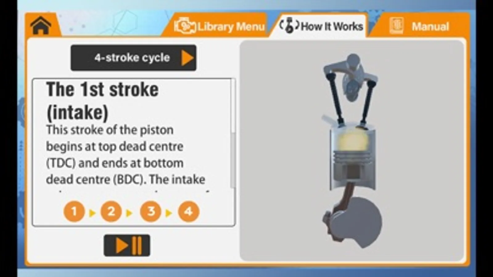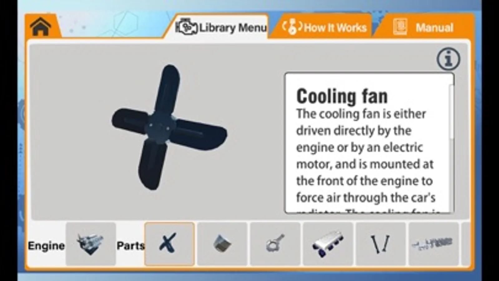 Use your finger to rotate the images and animations on your smartphone to explore and learn about the various parts and functions of the engine. The glossary of engine parts includes an image of each, as well as a full written description.