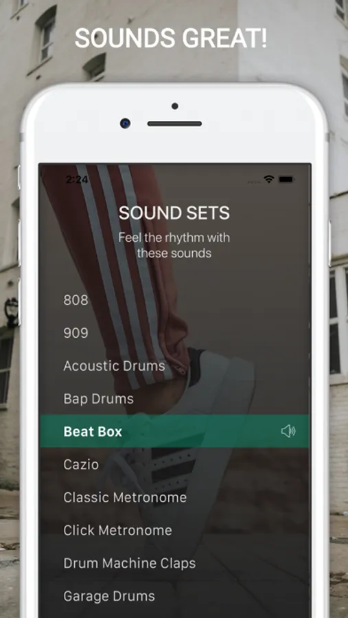 With Hey Metronome, you can put your earbuds on and control everything with your voice, from tempo and meter, to beat patterns, to even what song you are practicing. Just say, “Hey metronome set the tempo to 120,” “Hey metronome, shuffle,” or “Hey Metronome, next song,” and you’re off.