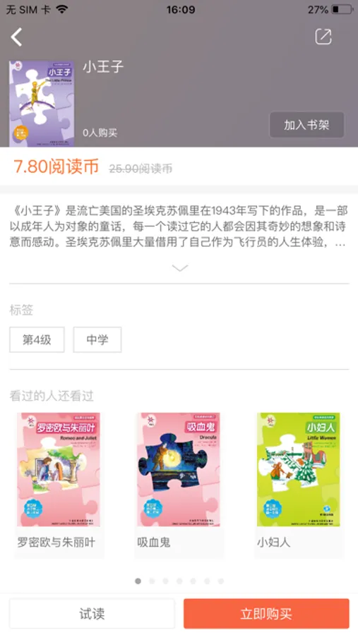 原汁原味中英文经典名著,适合中小学生课堂和课外阅读【正版资源】外研社正版资源,全本无删,原版原式。世界名著、名人传记、优美诗歌、励志故事、抒情散文…… 绘声绘色,悦读经典。让英语阅读成为孩子课内课外的快乐体验!【有声点读】精选读本支持全文点读,真人纯正英文发音。【免费听书】全场免费听名著、听传记、听诗歌,英语听力训练必备。