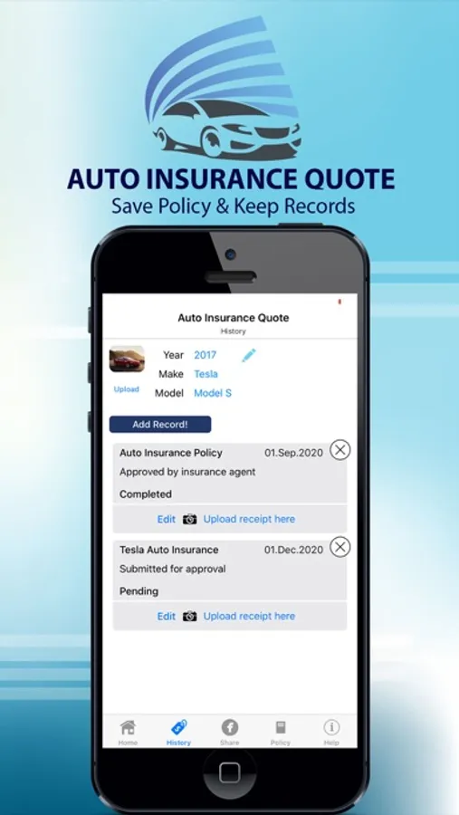 In history section you may also track your policies, so you don’t miss the renewal date. If you need to save your receipt, just upload it to the history.