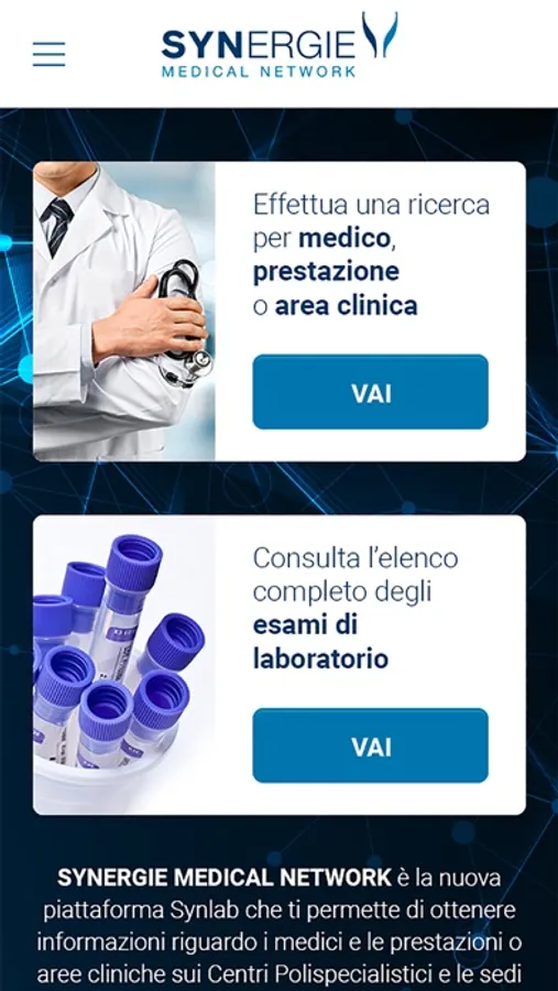 SYNERGIE MEDICAL NETWORK è l’esclusiva piattaforma al servizio dei Medici Synlab, che consente di accedere a tutte le informazioni relative alla squadra, alle prestazioni erogate presso le varie sedi e alle ultime novità scientifiche e formative del gruppo