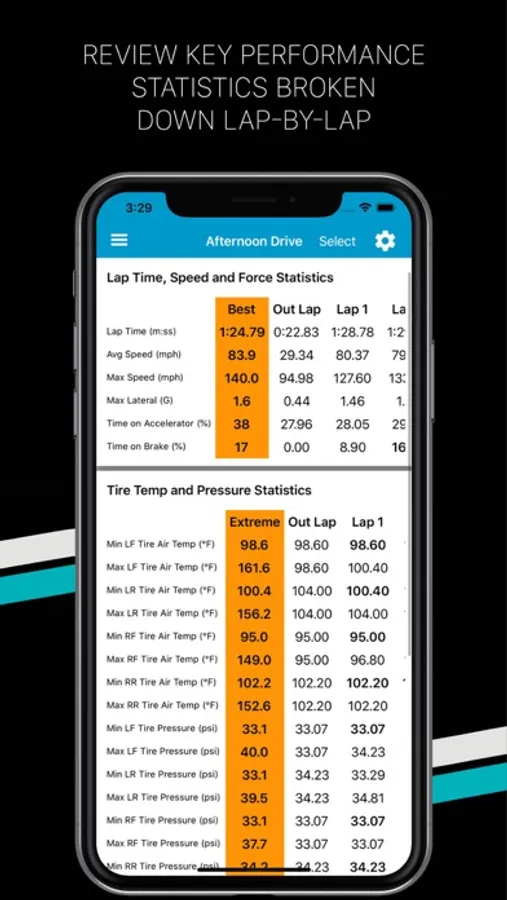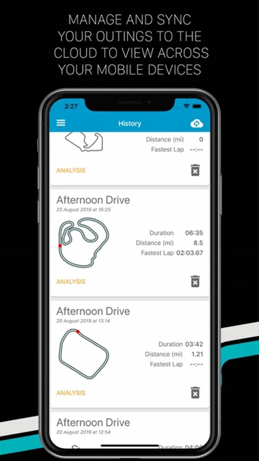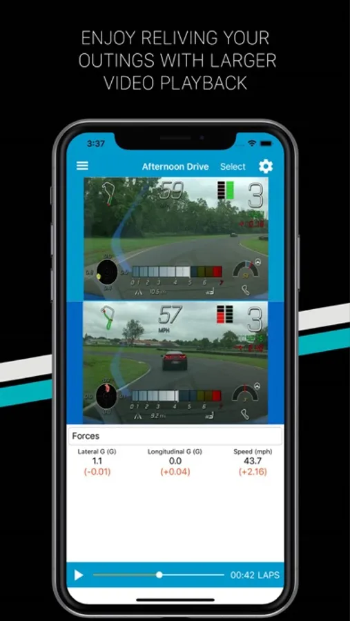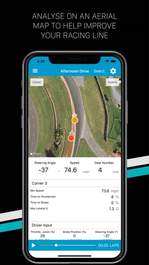 Select laps from one or two outings to analyse your performance. Easily pick out interesting moments with charts. Identify your best laps with lap-by-lap statistics. Relive your drives with side-by-side video playback. Compare and improve your racing line with 10Hz GPS data displayed on aerial maps.