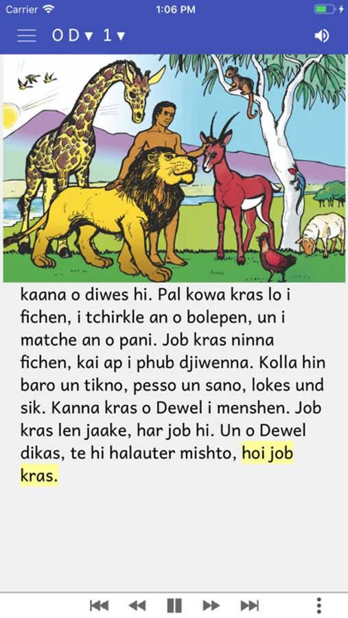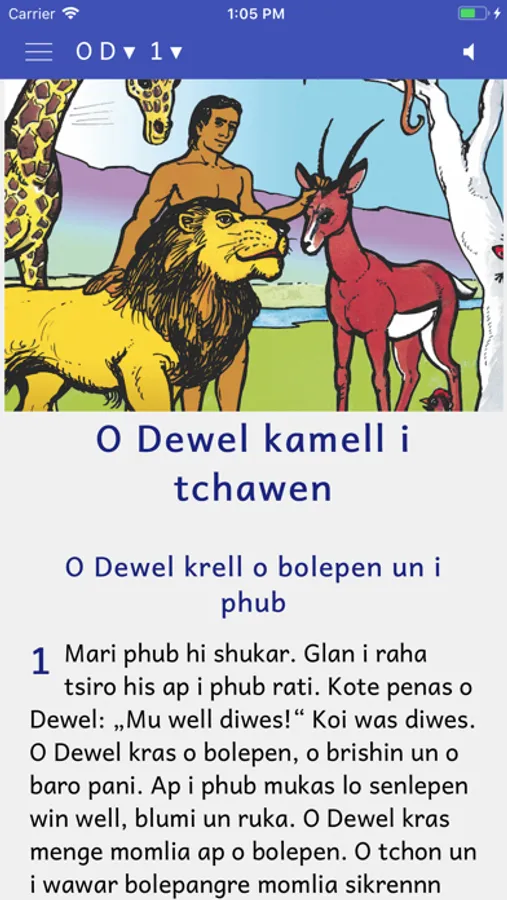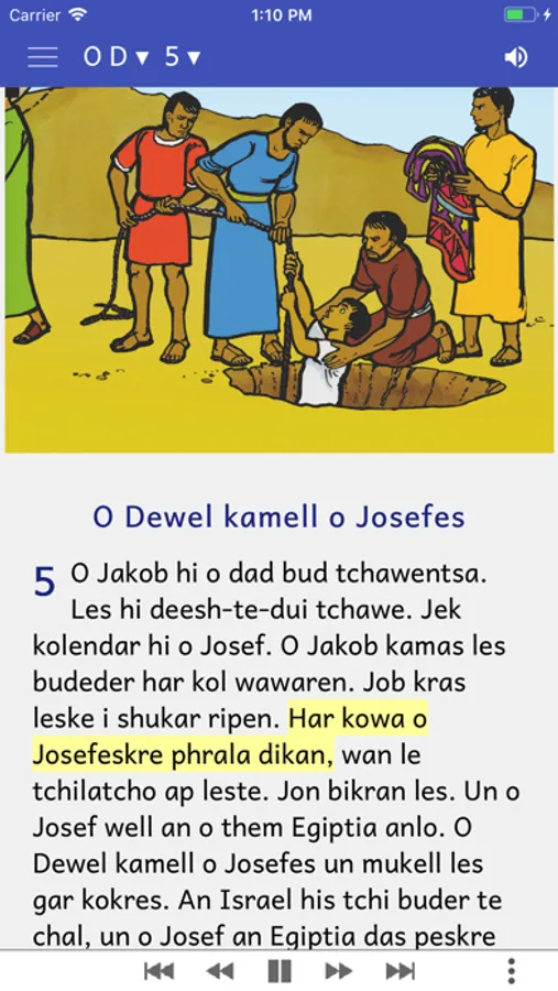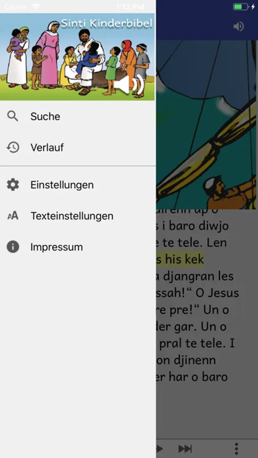 Die Sinti Kinderbibel gibt es jetzt auch als App für iPhones und iPads! Die App enthält 25 biblische Geschichten mit Audio und Bildern. Den Text kann man bequem mit zwei Fingern vergrößern oder verkleinern. Das Audio ist synchronisiert, das heißt, dass die Wortgruppe, die gerade gesprochen wird, im Text farbig markiert wird. Das erleichtert Kindern das Mitlesen. Wenn das Audio abgespielt wird, bewegen sich die Bilder mit Ken-Burns-Effekt. Dreht man den Bildschirm auf Querformat, wird die Illustration als Vollbild angezeigt. Den Text kann man per Untertitel mitlesen.