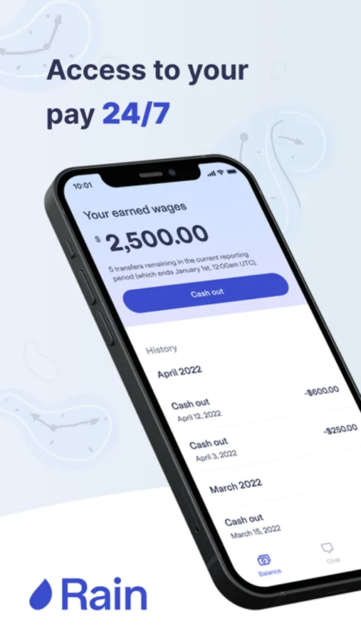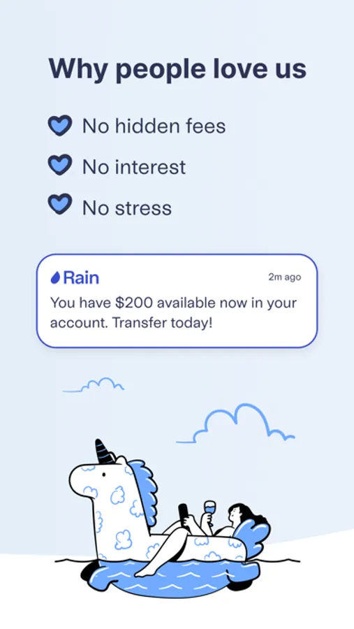 Rain is on a mission to eliminate the need for payday loans, overdraft fees, and high-interest credit cards. With the Rain app, you can easily gain access to a portion of your paycheck before payday! Rain allows you to access the money you've already earned, and you can make a request on the Rain app at any time. All you have to do is add a card (any card) to the app and transfer funds from Rain to yourself when you're ready. Access to the money you've already earned reduces stress and makes paying bills easy when you are short on cash.