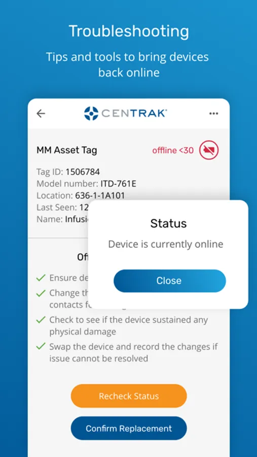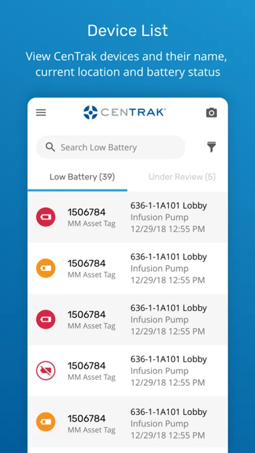 The app allows CenTrak customers to view which devices require a battery change, which devices are under a battery replacement review, and which, if any, battery replacements failed.