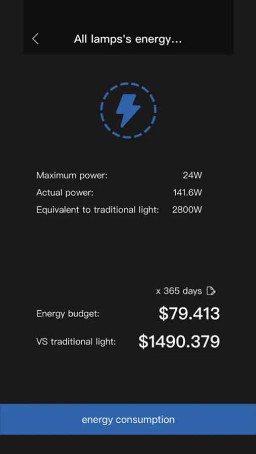 In this interface, the customer can intuitively see the maximum power of the luminaire, the watt light parameters of the time power. Enter the electricity bill, you can check the cost of the lighting electricity, as well as the energy saving costs.