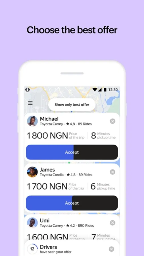 No more hailing on the street, hoping for a good driver. Select your pickup and destination points. Set the amount you want to pay. Check for the driver’s offers and choose the one that suits you best. And ride.