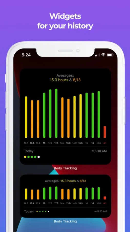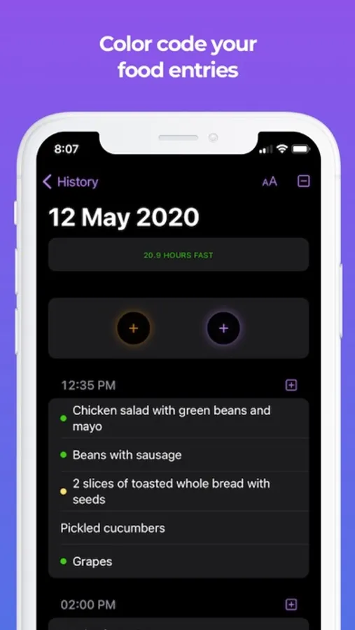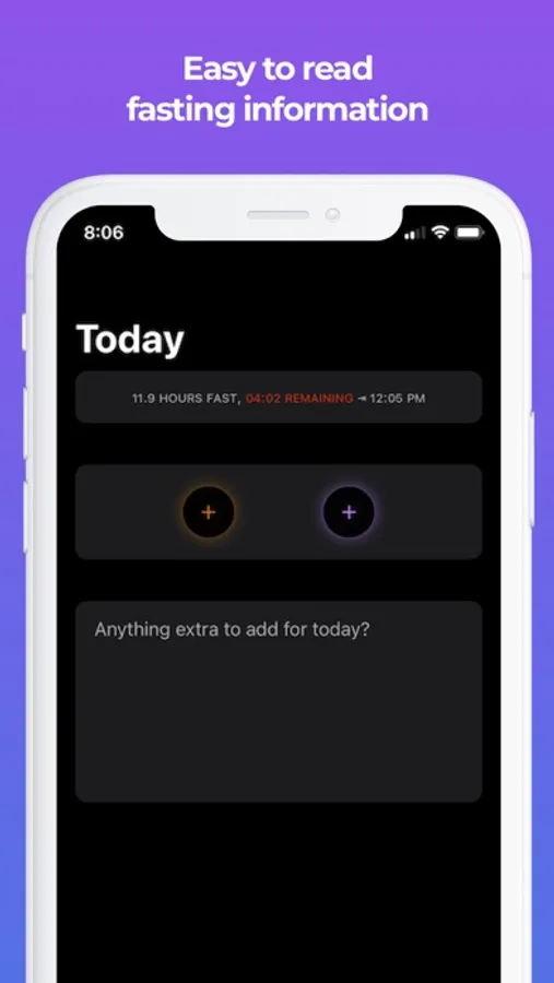 Track what you eat, but also how and when, by tracking habits, not calories. Are you into intermittent fasting? Track that as well — with a customisable period, ranging from 14 to 20 hours — and get notified when your fast ends. See at a glance how much time has elapsed and at what hour it ends.