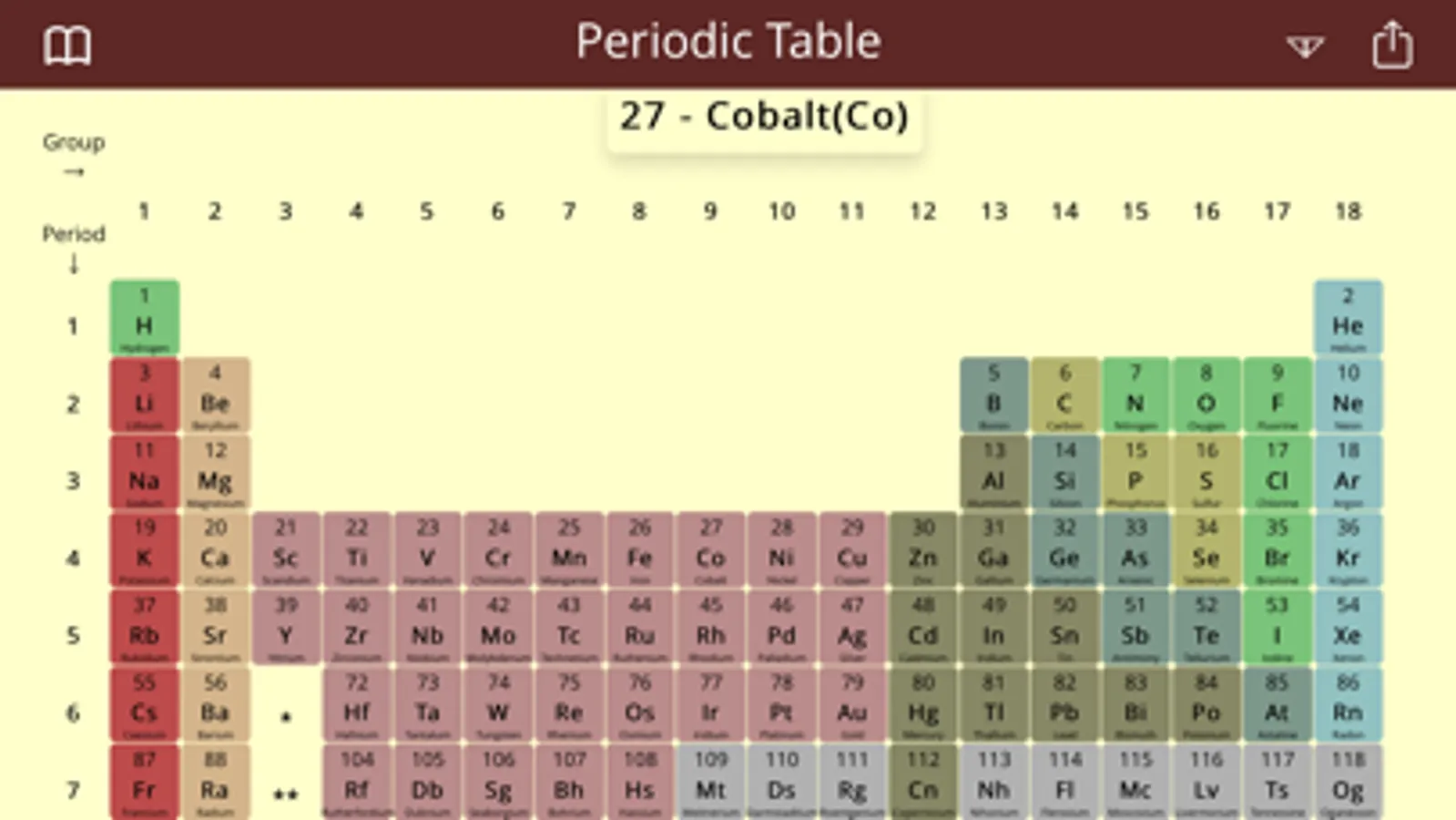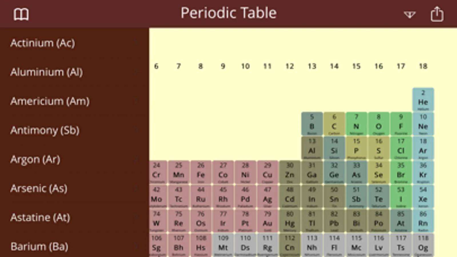 The periodic table is a tabular display of the chemical elements, organised on the basis of their properties. Elements are presented in increasing atomic number. The main body of the table is a 18 × 7 grid, with gaps included in to keep elements with similar properties together, such as the halogens and the noble gases. These gaps form four distinct rectangular areas or blocks. The f-block is not included in the main table, but rather is usually floated below, as an inline f-block would make the table impractically wide. The periodic table accurately predicts the properties of various elements and the relations between properties. As a result, it provides a useful framework for analyzing chemical behavior, and is widely used in chemistry and other sciences.